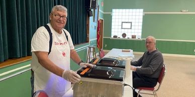 Our process for making these foods usually take two mornings. For pierogi, volunteers meet to make the filling (either potato and cheese or cabbage) then the next day, we make and sheet the dough, and cut out the rounds. The "pinchers" then stuff the dough. After inspection to ensure a secure seal, the kitchen staff takes over to cook and cool the pierogi. Once the proper temperature is reached, the pierogi is then vacuum sealed.